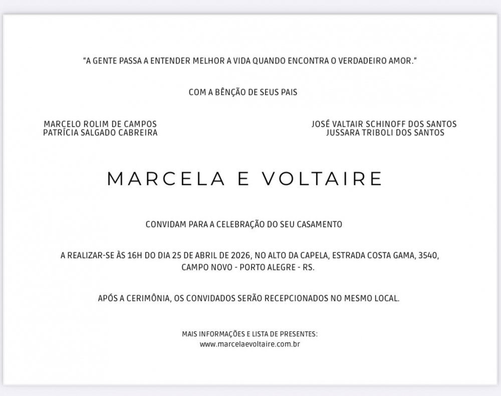 Estamos muito felizes em poder compartilhar o dia do nosso casamento com vocês. Por conta da Lei n 15.234/2025, a cerimônia e a festa serão exclusivas para maiores de 18 anos. O espaço está em adequação às normas e limita a presença de menores em ambientes onde haverá livre circulação de bebidas alcoólicas.